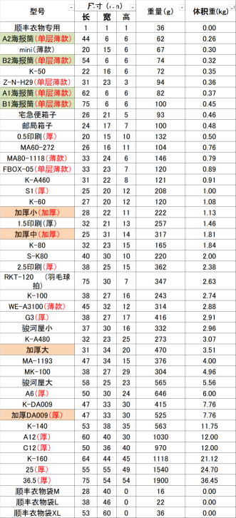 平台打包空箱尺寸(cm)和重量(g)以及体积重(kg)